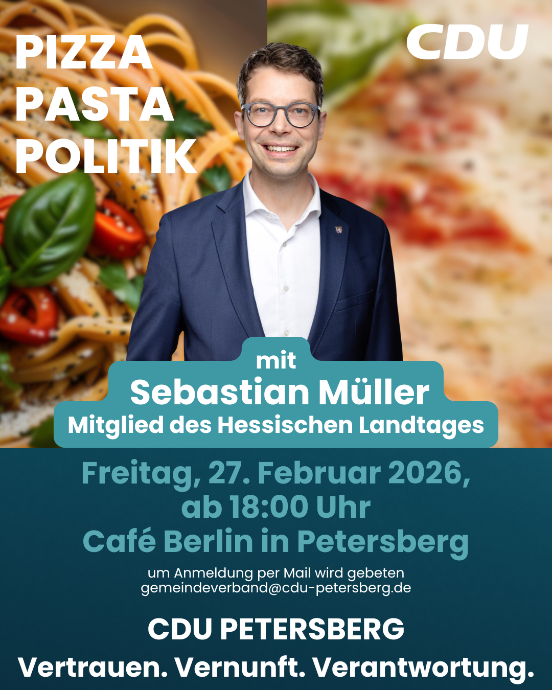Die CDU Petersberg lädt alle Bürgerinnen und Bürger am Freitag, 27.02.2026, ab 18:00 Uhr zum After Work Event „Pizza, Pasta, Politik“ mit unserem CDU-Landtagsabgeordneten Sebastian Müller ins Café Berlin (Propsteihof 3) nach Petersberg ein.